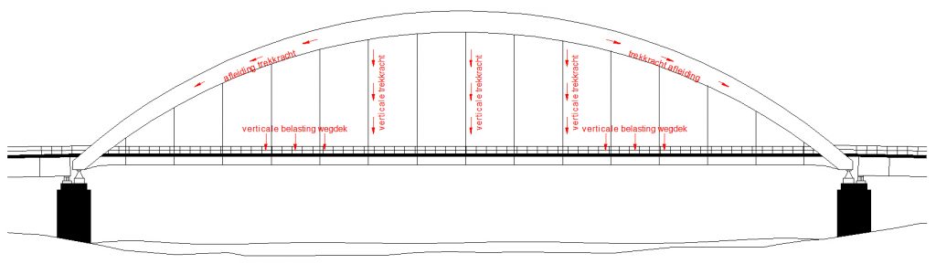 belasting via de trekbanden afgeleid door de boogconstructie naar de fundering van de brug. De constructie van de brug bestaat